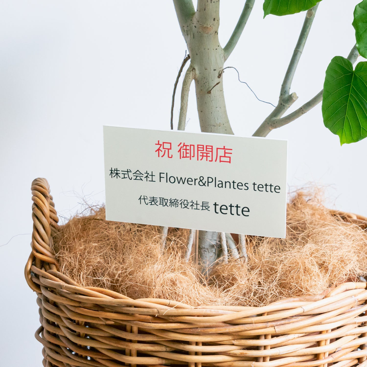 お祝いのお花や観葉植物には立て札かメッセージカードを添えます。法人ギフトには立札、フォーマルな個人ギフトにはメッセージカードがおすすめです。