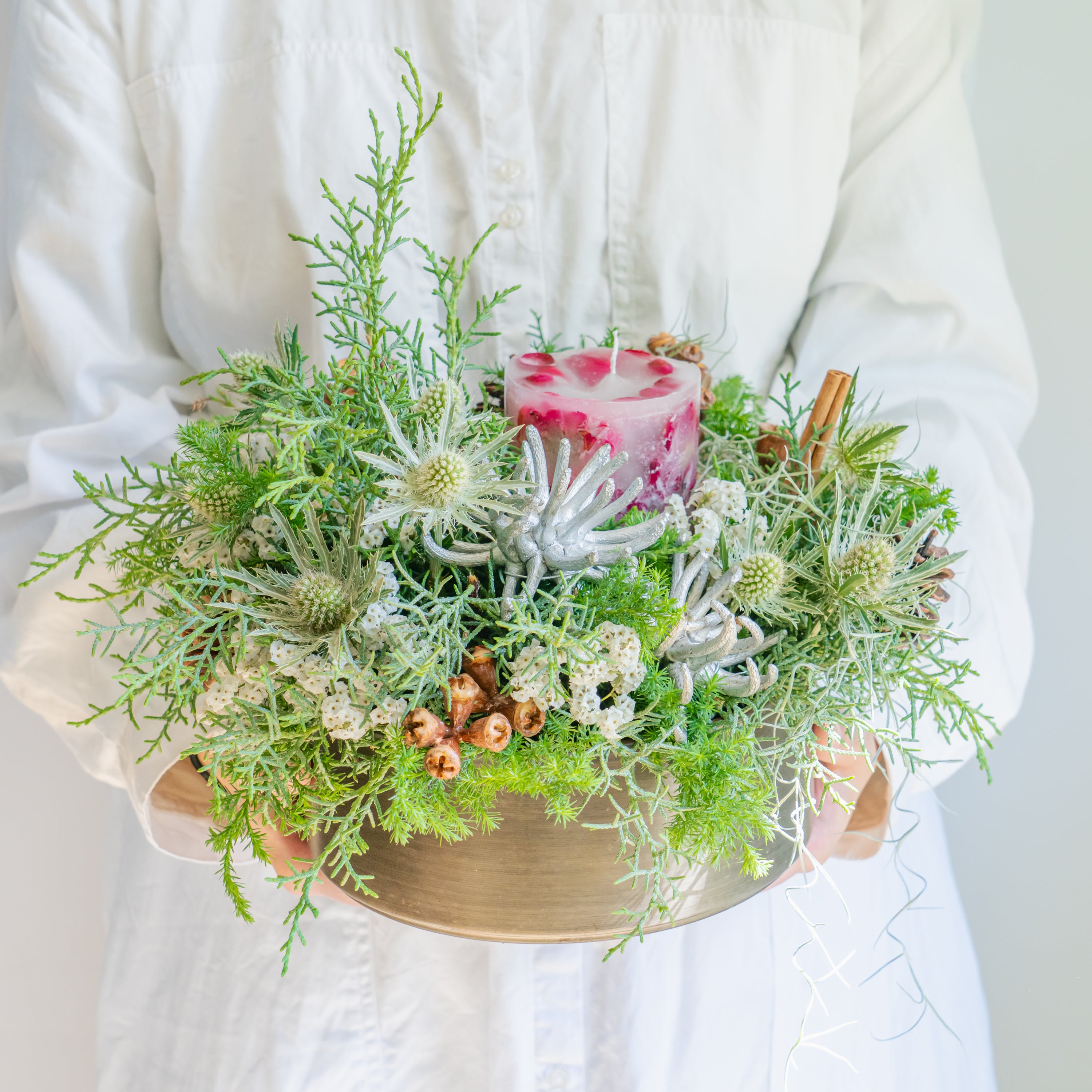 クリスマスキャンドルアレンジメントは四方見でアレンジしておりますのでダイニングテーブルやカウンターなど置く場所を選ばずに飾っていただけます🎅