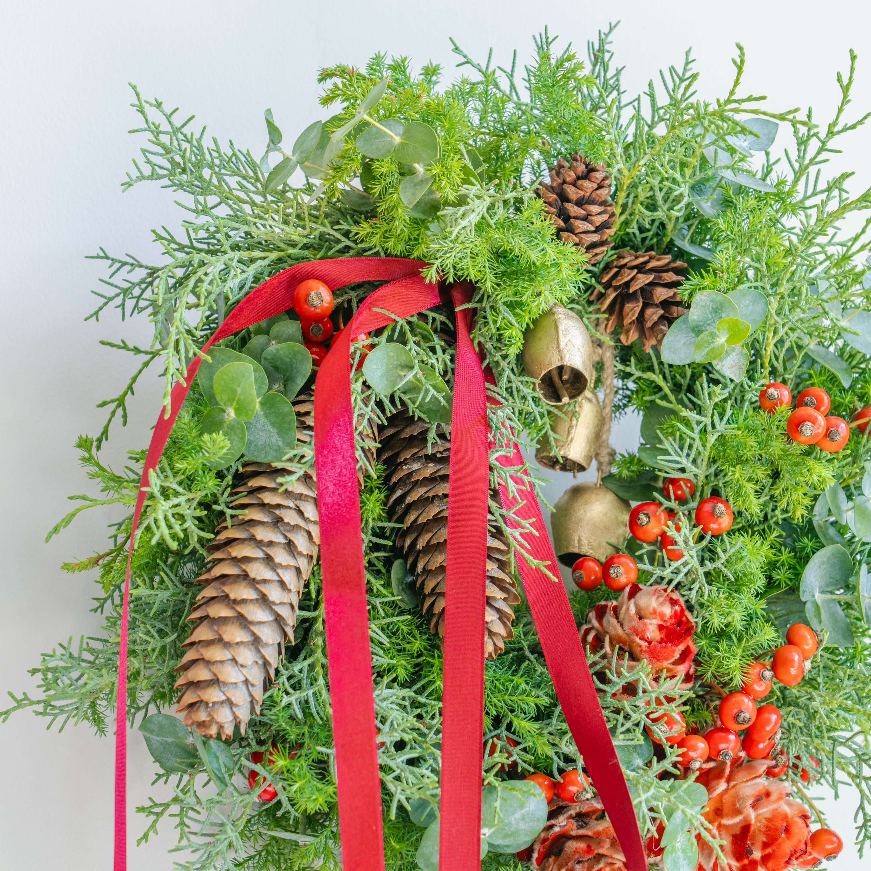 全て一点もので手作りしております。今年は王道カラーで赤いリボンにゴールドの鈴を合わせてシンプルでお部屋に馴染みやすいものをご用意しました!