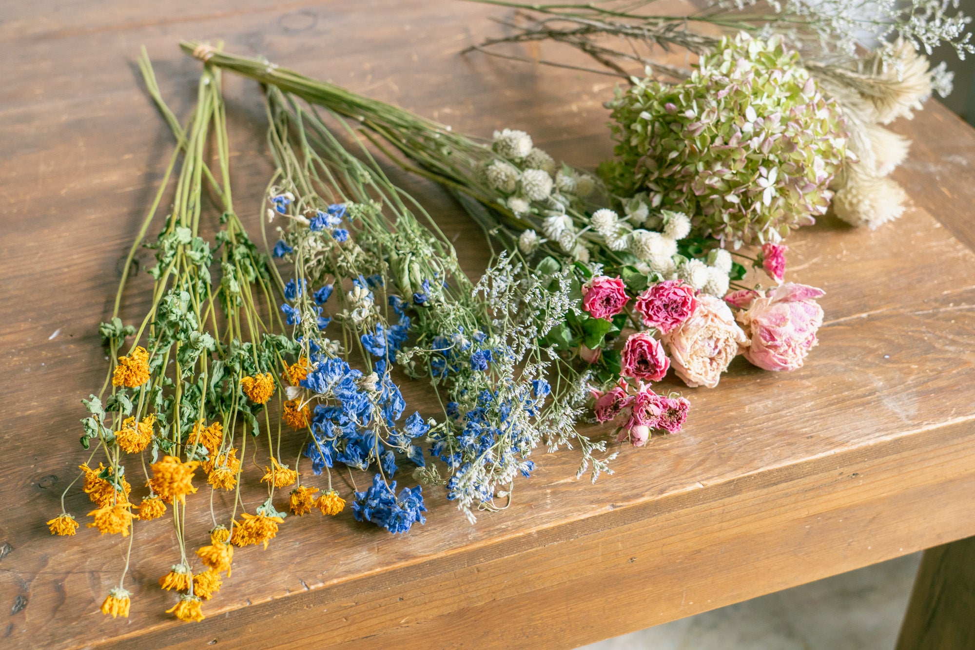 乾燥させることによって花の形状や色調が変化して独特の風合いを持つため、インテリアやデコレーションにも人気があります。